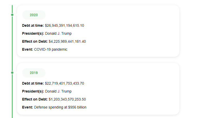 Research for this article on the U.S. national debt involved extensive historical data collection from the U.S. Treasury to create a picture of the change in national debt during each president’s time in office. The data also incorporated historical events such as war and COVID-19 which impacted the national debt during each administration.