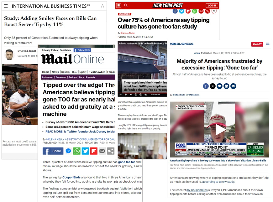 In the example above, we dove into the topic of tipping. Although there’s not a single trigger event that we were latching onto here – it’s a topic that where there’s been a growing debate around with even pilots (jokingly) holding signs after a flight asking for a tip. We crafted a survey of the U.S. population asking if tipping culture has gone too far and where people had been asked for tips. This hit a sweet-spot as journalists were more than happy to have useful content they could cover on a topic they knew readers cared about in that very moment.