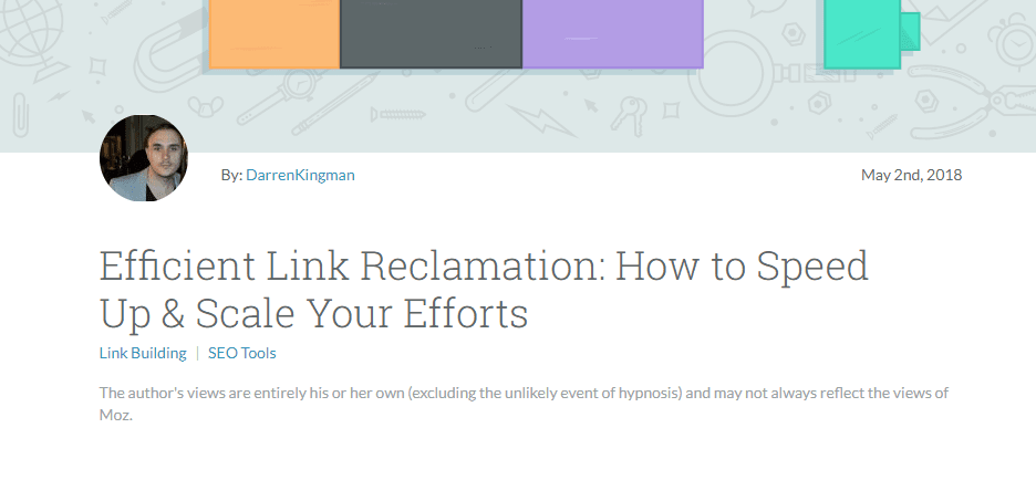 However, my name is established in some verticals and that’s through tactical placements. Having previously been a Senior Consultant at Builtvisible and written about link reclamation during my time there, I had the strength of their existing domain to work with. Separately, I’ve also been fortunate enough to write regularly for Moz, who a process centred post I produced on link reclamation ranks extremely well for.