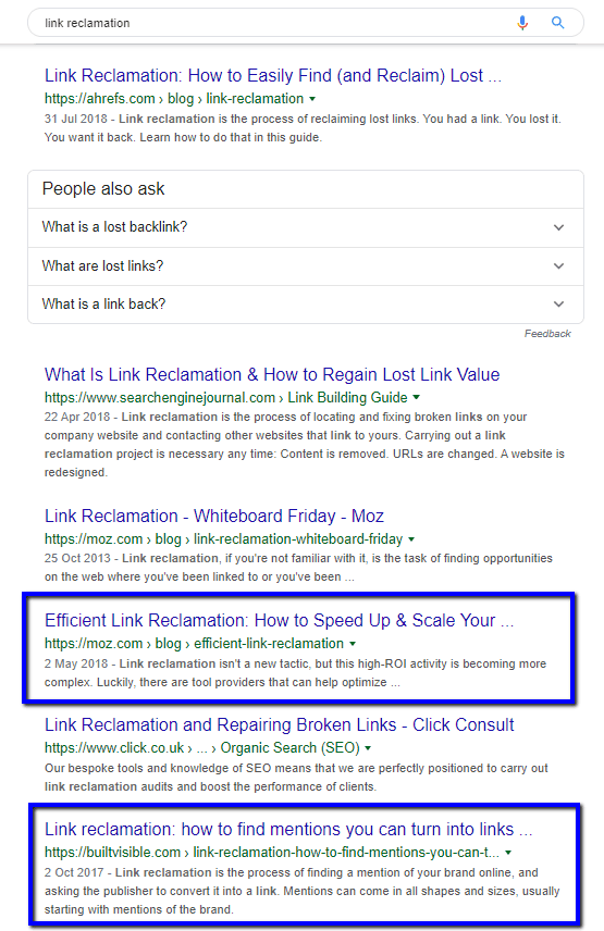 Here’s what the SERP looks like from London for the query ‘Link reclamation’ (guess who wrote the ranking results in position 4 and 6…):